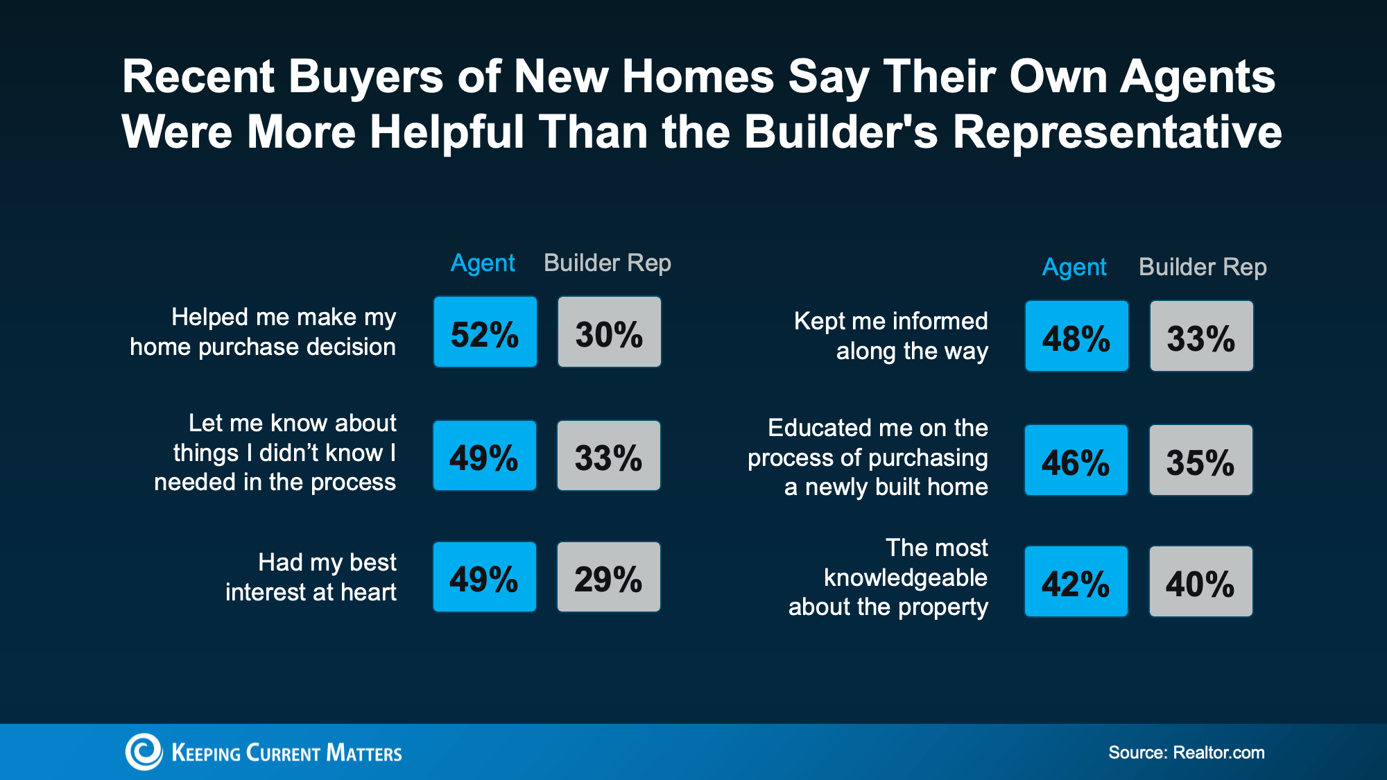 These stats seem to prove that’s the case. In a Realtor.com survey, buyers who purchased a newly built home rated their agents far more helpful than the builder (or the builder’s representative) during the process (see visual below):