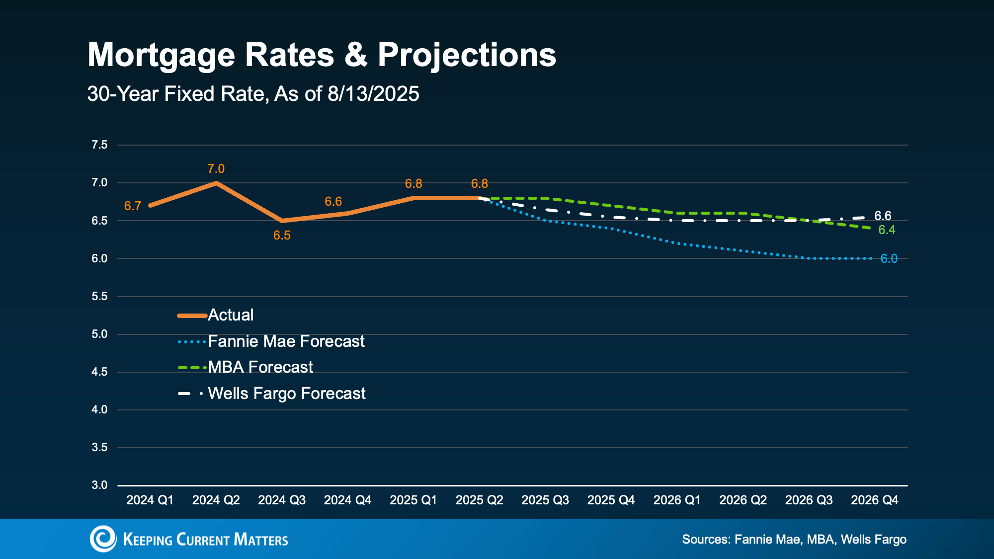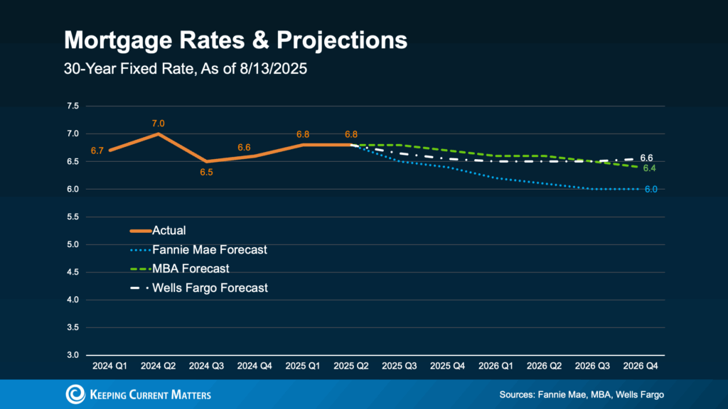 According to the latest forecasts, rates aren’t expected to fall dramatically anytime soon. Most experts project they’ll stay somewhere in the mid-to-low 6% range through 2026 (see graph below):