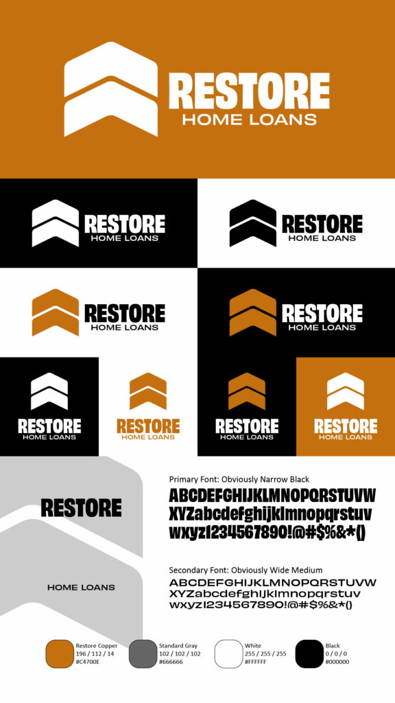 Color plays an important role in the identity. The rich Restore Copper (#C4700E) was chosen for its warmth and grounding qualities, evoking both stability and optimism. Paired with strong black and clean white, the copper stands out as a vibrant accent while still maintaining a professional tone. The supporting Standard Gray adds balance and flexibility for different applications, whether in print, web, or signage.