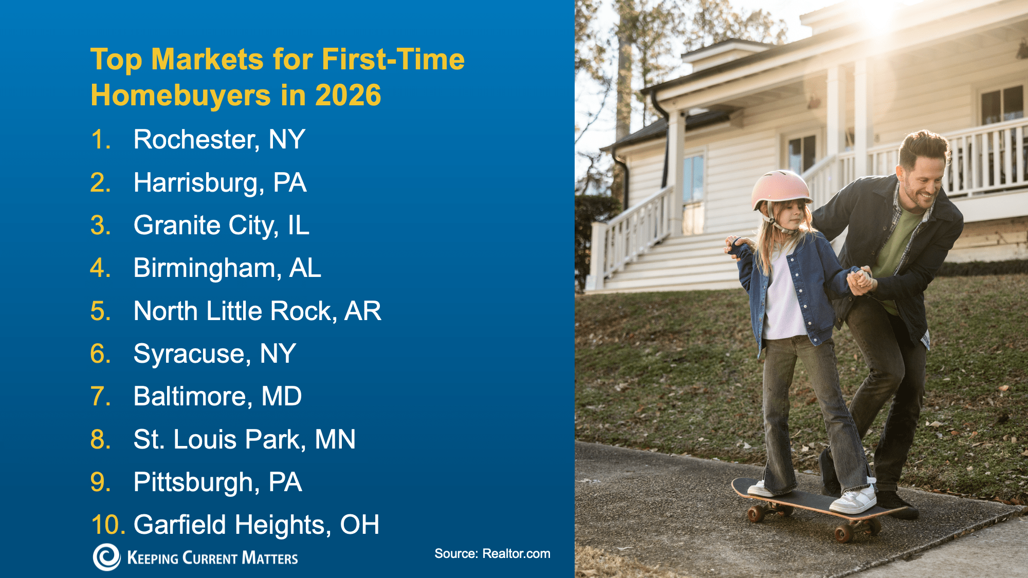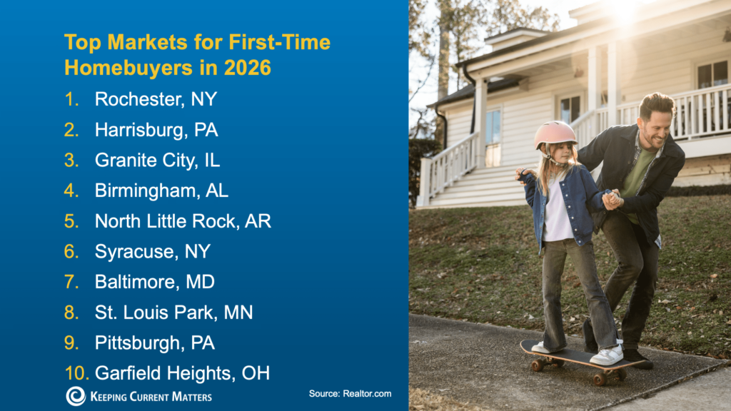 On the flip side, here’s a look at where buyers have the power – in particular, first-time buyers, since they’ve had the hardest time breaking into the market lately. Realtor.com highlights the top metros where first-time buyers are expected to have better opportunities in 2026: